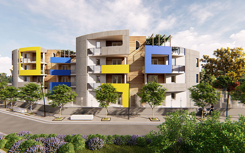 I due edifici più alti, presentano una struttura apparentemente curvilinea dovuta soprattutto all’andamento degli sbalzi e fornendo la doppia particolarità di caratterizzarsi sul piano formale e di creare ampi spazi esterni agli appartamenti con balconi e terrazze. Lo stile architettonico è denunciato da piani e sette murari spesso colorati, che fuoriescono dai volumi con una legge di crescita ortogonale e mai obliqua.