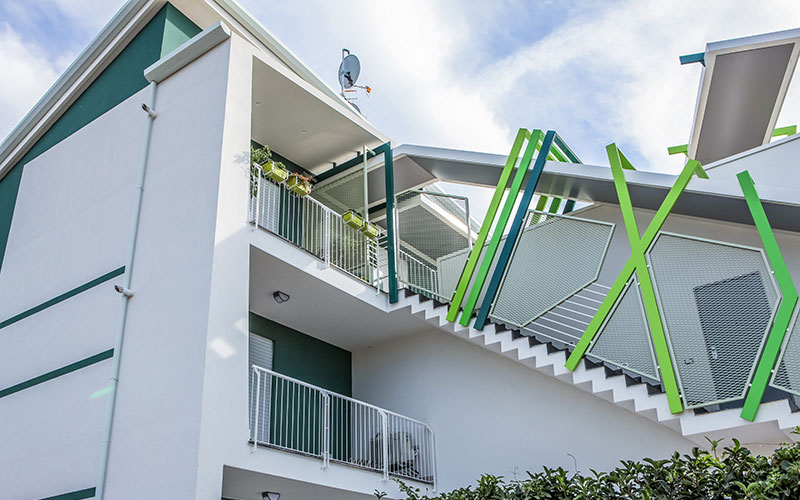 Lo spazio comune è stato realizzato secondo i criteri di una piena accessibilità per consentirne a tutti la massima fruibilità, con uno stile architettonico geometrico, instabile, articolato da forme pure, disarticolate, tagli, asimmetrie e da volumi e frammenti alterati con l’assenza di canoni estetici tradizionali.