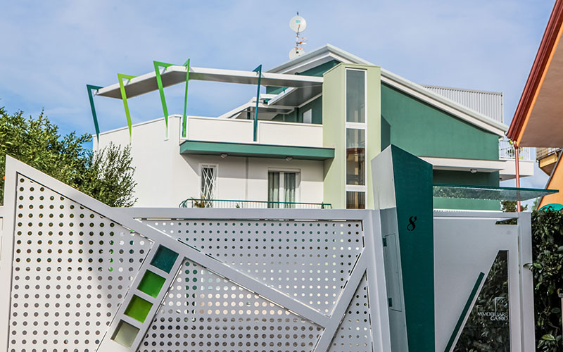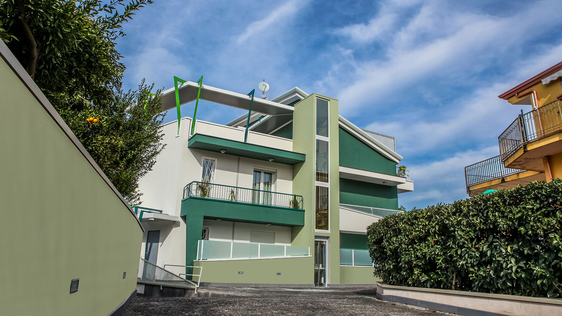 Esso si compone di tre ampi e luminosi appartamenti con annessi garage nella zona sottostante al fabbricato, con posti auto esterni e con la presenza di un ascensore che assicura ad ogni abitazione, un accesso autonomo.